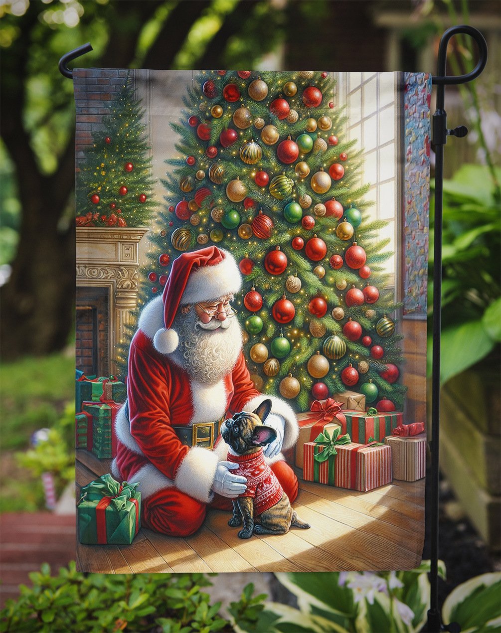 Garden Flag featuring breed specific French Bulldog artwork. Celebrate Christmas with this Christmas Garden Flag. Enhance the beauty of your garden, patio, or yard with Caroline's Treasures Decorative Garden Flag, proudly made in the USA. Crafted from two pieces of thick, double-sided polyester fabric, this 2-ply garden flag is designed to withstand various weather conditions, making it water-resistant and weatherproof. Featuring correctly readable words on both sides, this garden flag offers a delightful visual experience from any angle. With its heavier weight, it stands out among other garden flags, ensuring stability and durability even in wind, rain, and snow. Measuring approximately 11 1/4 inches by 15 1/2 inches, this flag allows you to personalize your outdoor decor. It comes with a 1 1/2-inch sleeve sewn in, allowing easy attachment to any standard garden flag stand or garden size porch hanger (sold separately). Make a statement in your outdoor space with Caroline's Treasures Decorative Garden Flag, a vibrant and high-quality flag that adds color and personality to your surroundings. Proudly made in the USA, it's a symbol of quality craftsmanship and attention to detail.