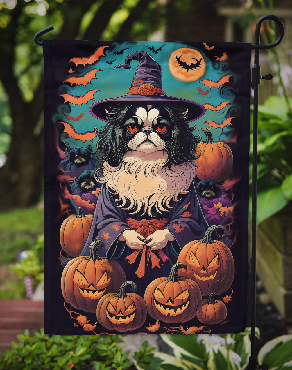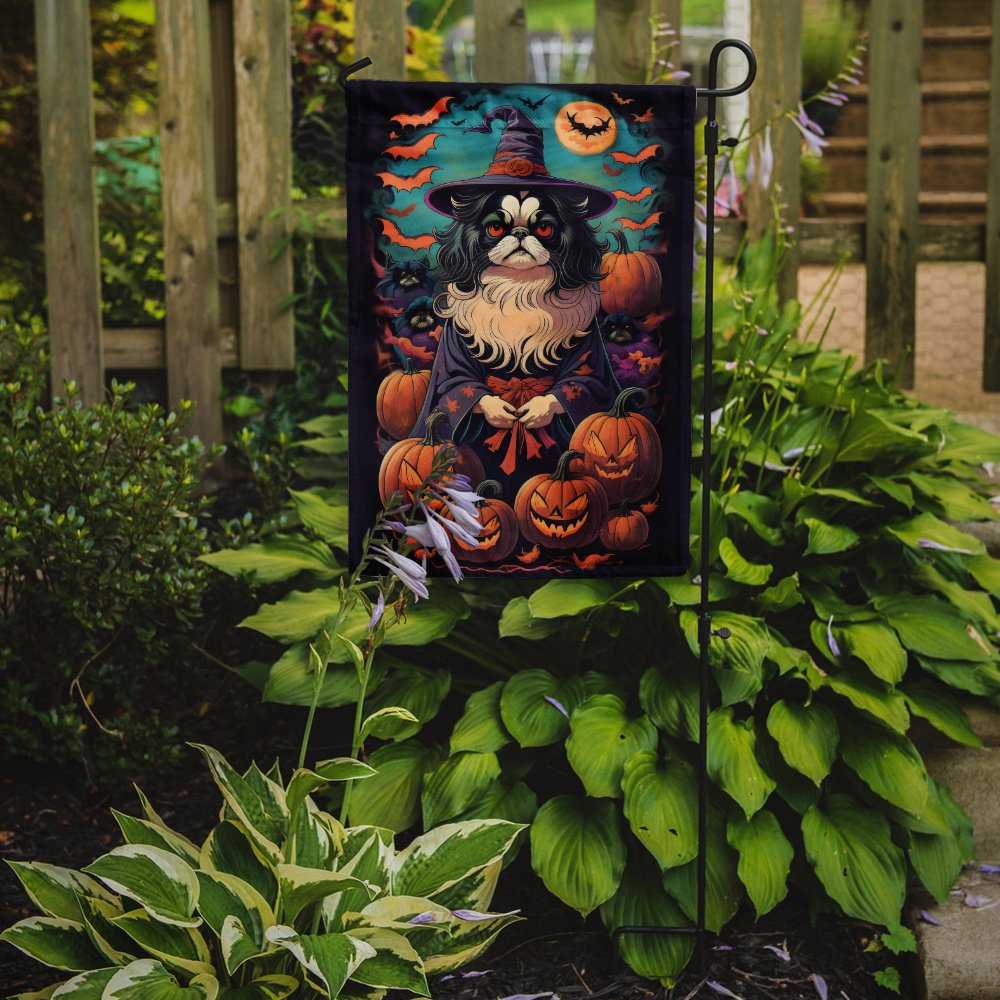 Garden Flag featuring breed specific Japanese Chin artwork. Celebrate Halloween with this Halloween Garden Flag. Enhance the beauty of your garden, patio, or yard with Caroline's Treasures Decorative Garden Flag, proudly made in the USA. Crafted from two pieces of thick, double-sided polyester fabric, this 2-ply garden flag is designed to withstand various weather conditions, making it water-resistant and weatherproof. Featuring correctly readable words on both sides, this garden flag offers a delightful visual experience from any angle. With its heavier weight, it stands out among other garden flags, ensuring stability and durability even in wind, rain, and snow. Measuring approximately 11 1/4 inches by 15 1/2 inches, this flag allows you to personalize your outdoor decor. It comes with a 1 1/2-inch sleeve sewn in, allowing easy attachment to any standard garden flag stand or garden size porch hanger (sold separately). Make a statement in your outdoor space with Caroline's Treasures Decorative Garden Flag, a vibrant and high-quality flag that adds color and personality to your surroundings. Proudly made in the USA, it's a symbol of quality craftsmanship and attention to detail.