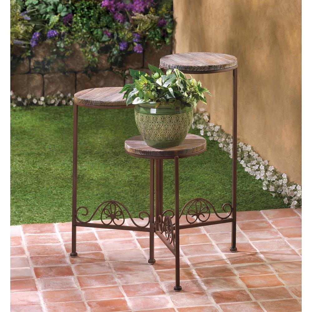 • Weathered wood and rustic finish lend a timeless look to this handsome planter stand! Folding configuration and three graduated pedestals let you arrange your favorite greenery for maximum style impact.