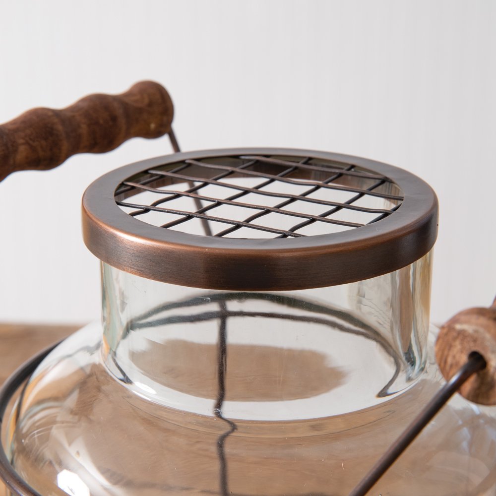 Bring a floral touch to a room with our Milk Can Flower Frog Vase. Grand in size, this vase makes a statement on a table and would create a beautiful bouquet. The glass milk can sits in an antique copper caddy with wood handles.
